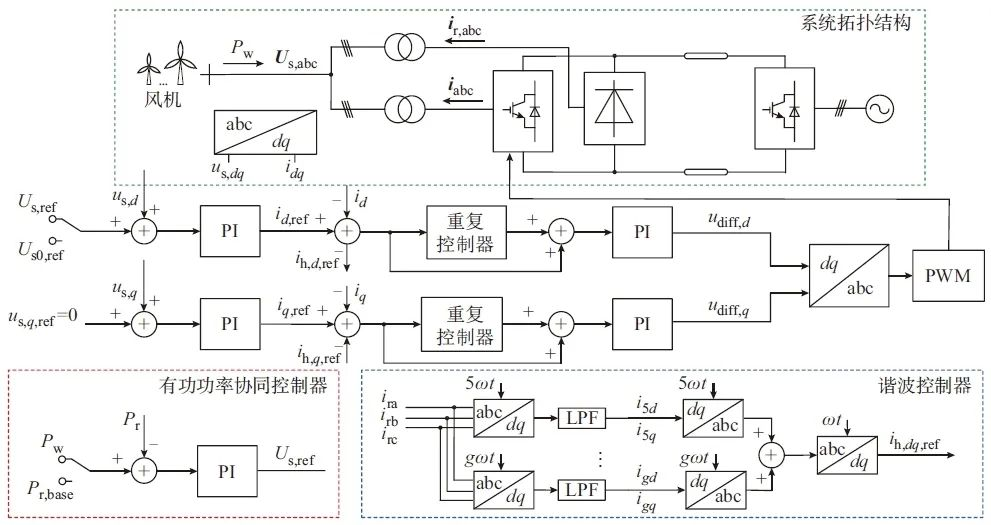 控制策略1)有功功率协调控制策略同电压等级和容量的DRU传输损耗约为MMC的10%,大部分有功功率通过DRU传输能减小损耗。DRU有功功率与公共连接点(PCC)处交流母线电压幅值呈线性关系,因此,可以通过MMC控制交流母线电压Us来实现DRU-MMC混合送出系统的有功功率协同控制。2)谐波电流抑制策略汇入风电场的谐波电流大小与风电场等值谐波阻抗Zhw、MMC等值谐波阻抗Zhm以及DRU等值谐波阻抗Zhr有关。令k为Zhr与Zhm的比值。当k→∞时,MMC谐波电流有效值与风电场谐波电流之比约为1∶1。当k→0时,所有DRU谐波电流将汇入风机侧,给电网和用电设备带来严重危害。为了防止k值过小或Zhw过小造成汇入PCC的电流谐波含量过大,设计MMC谐波控制器,以补偿风电场谐波电流。系统控制框图如图2所示。