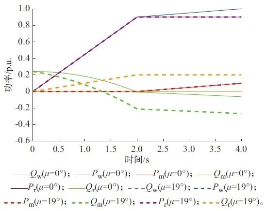 从图3中可以看出,随着换相重叠角变大,DRU的无功功率增加,MMC需提供的无功功率也增大。当风电场发出的有功功率Pw=1 p.u.时,MMC的有功功率和无功功率达到最大值,分别为0.1 p.u.和0.266 8 p.u.。